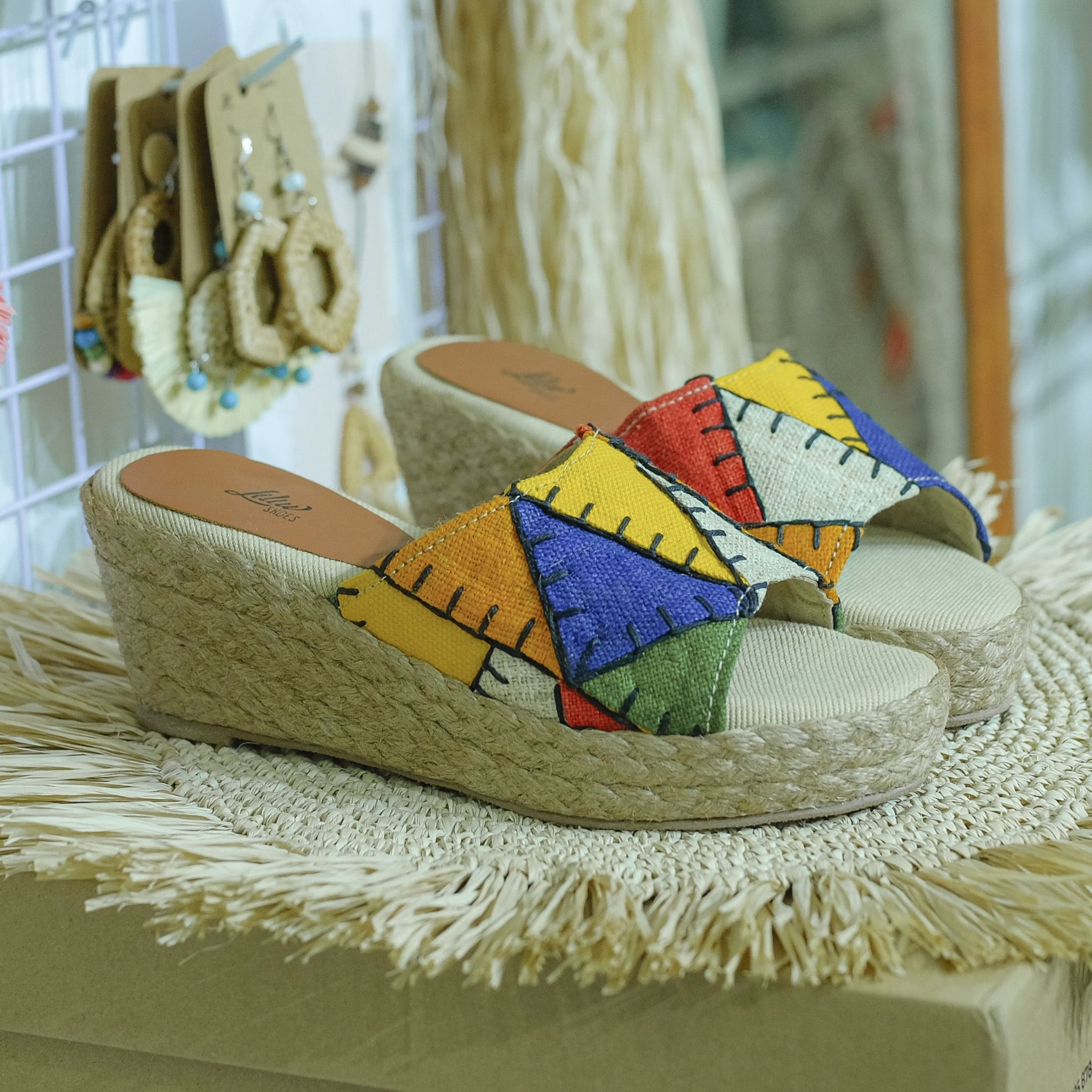 Phiên bản dép hở mũi đế xuồng của dòng cói Liliw ghép vải hemp nhiều màu.